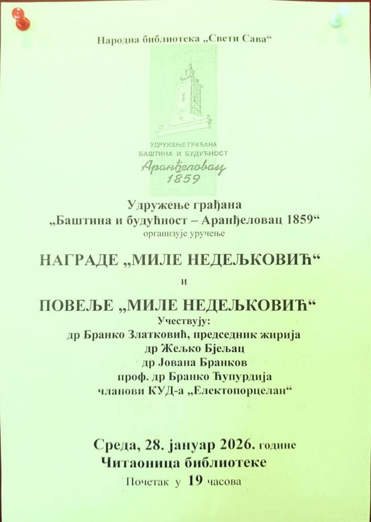 Вечерас је у Народној библиотеци “Свети Сава” у Аранђеловцу, уприличена церемонија доделе Награде “Миле Недељковић” и Повеље “Миле Недељковић” за животно дело, у организацији Удружења грађана “Баштина и будућност – Аранђеловац 1859”.