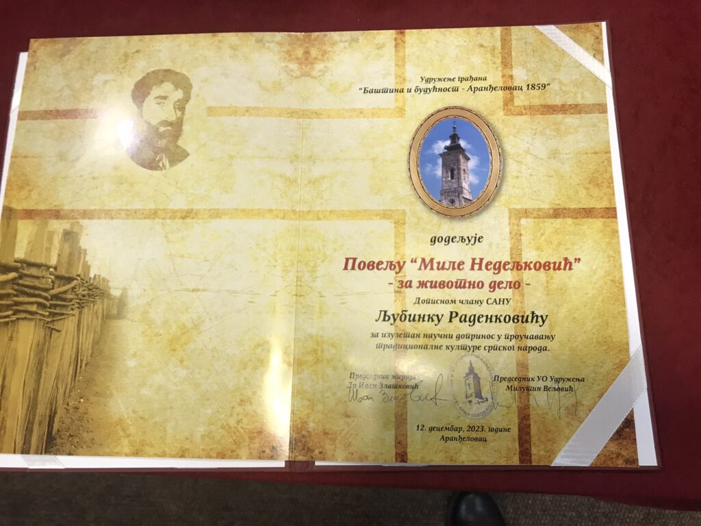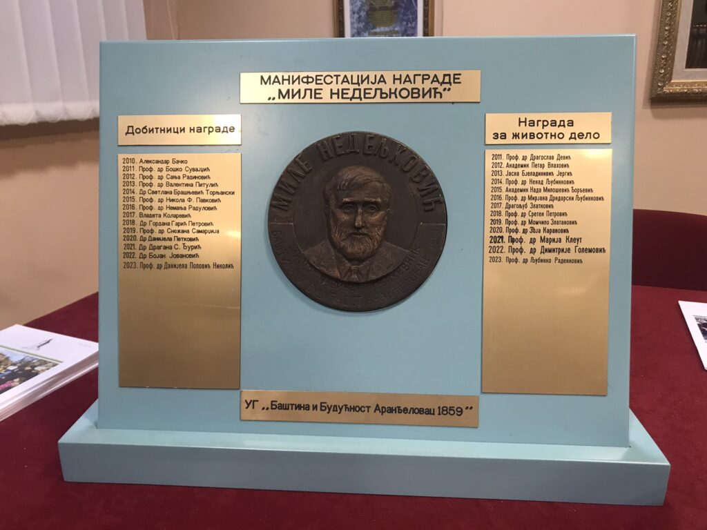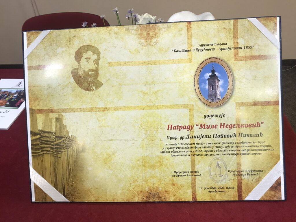 Удружење грађана ”Баштина и будућност – Аранђеловац 1859” из Аранђеловца, традиционално додељује награду ”Миле Недељковић” за најбољу објављену књигу из области савремене српске фолклористике (етнологије и антропологије, етномузикологије и народне књижевности), за претходну 2023. годину. Награда носи име једног од најзначајнијих наших етнолога, проучавалаца народне баштине и историје, публицисте и педагога. Жири који је изабрао најбољу студију чине признати научници: др Бранко Златковић (председник), Јелена Јовановић, дописни члан САНУ, и др Смиљана Ђорђевић Белић.